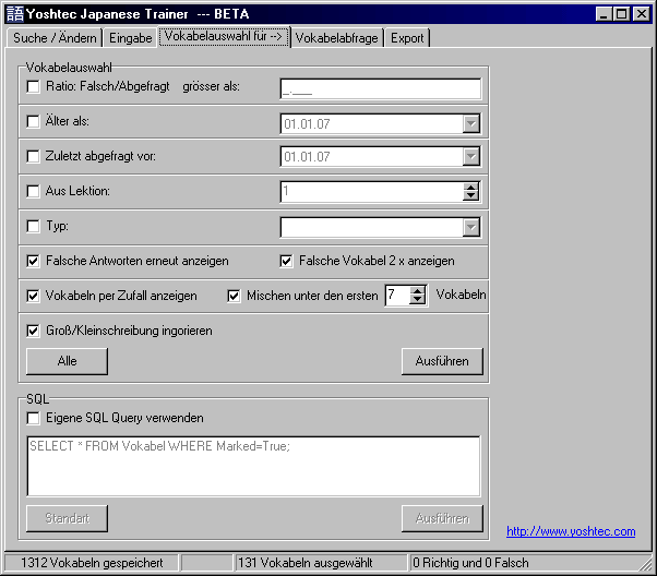 Hier kann mand die Vokabeln nach verschieden Kriterien ausw�hlen, um sie dann zu lernen oder zu exportieren.