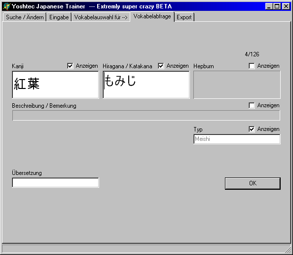 Je nach vorheriger auswahl werden hier die Vokabeln abgefragt. Und man kann einstellen welche Informationen man �ber die Vokabel haben m�chte, wie Kanji oder Katakana/Hiragana oder Romaji usw..